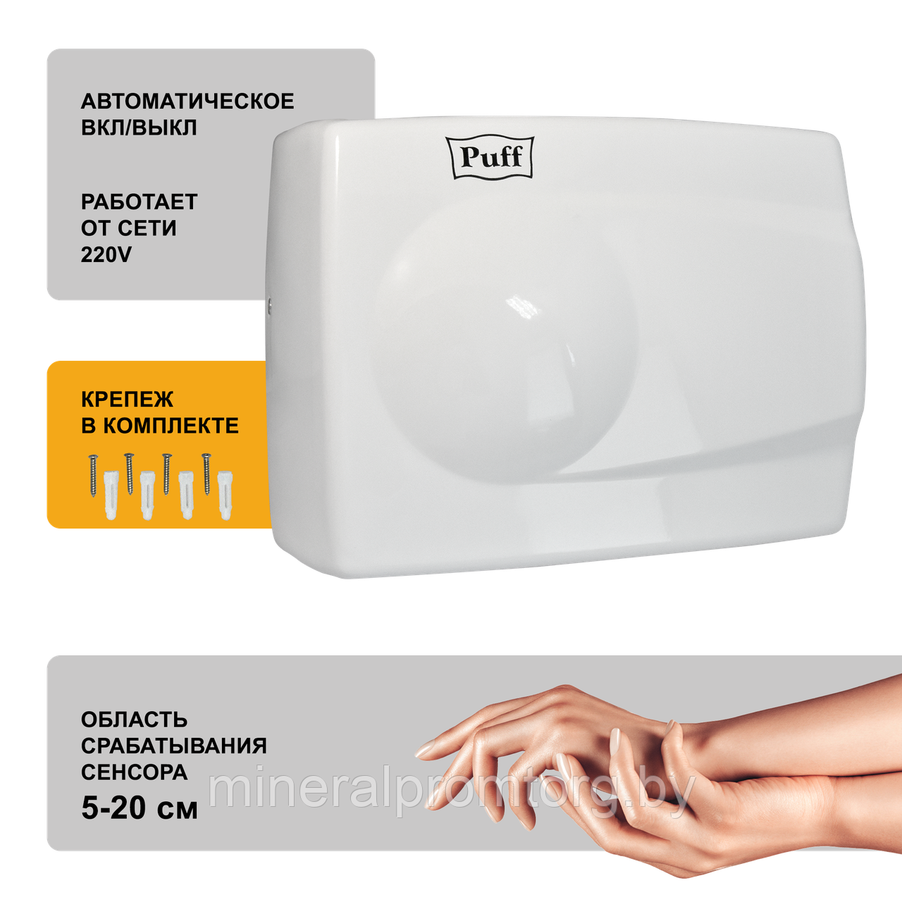 - Область срабатывания сенсора: 5-20 см